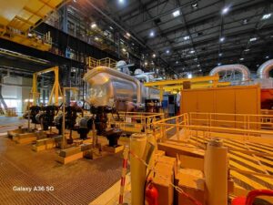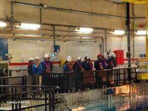 Enfin, le groupe s’est rendu en salle des machines pour observer le groupe turbo alternateur et entrevoir le condenseur, avant de pourvoir observer de l’extérieur le transformateur, l’aéroréfrigérant, les diesels de secours et les bâches de stockage, entre autres. La délégation a été impressionnée par la superficie d’une part et les conditions de sécurité et de sûreté d’autre part.